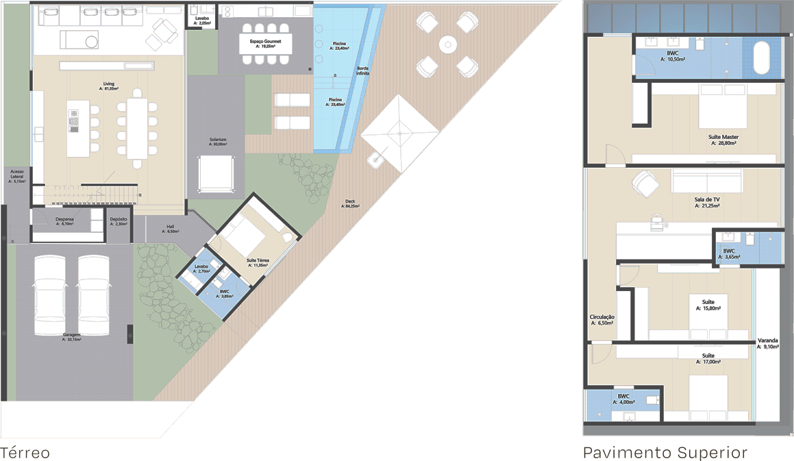 1 Suíte Master 28,80m² 2 Suítes 1 Suite Térrea